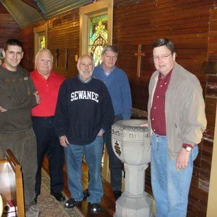 Nathan Brinklow transported the furnishings from Ontario to Eatonton. Nathan, Jim Wagner, Father John Keeler, Bob Ritchason, and Jim Marshall installed the font. Nathan, who is a designer of church paraments (altar linens, hangings, etc.) and clergy vestments, sewed our green paraments.