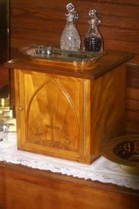 When Holy Trinity Church in Shannonville, Ontario, was closed in 2007, we were blessed with the gifts of a limestone baptismal font, a brass and silver processional cross, and a wooden tabernacle (used for storing reserved sacraments of bread and wine).