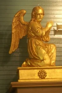 A pair of circa 1810 gilded carved wooden angels were placed on loan by a supporter and flank the altar.
